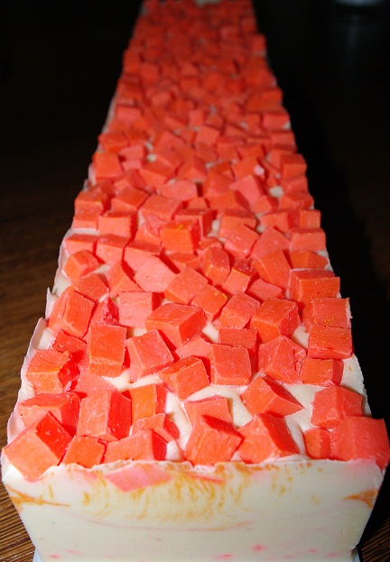 Yesterday I was soaping for valentines day, but the recipe I had was not enough, so I decided to double it. However, lazy as I am, I did so out of the top of my head and therefore forgot to double my palm oil. The consequence was that my beautiful inlays were all lye heavy. Thankfully I found out in time and could rebatch them, but it was a really stupid mistake.